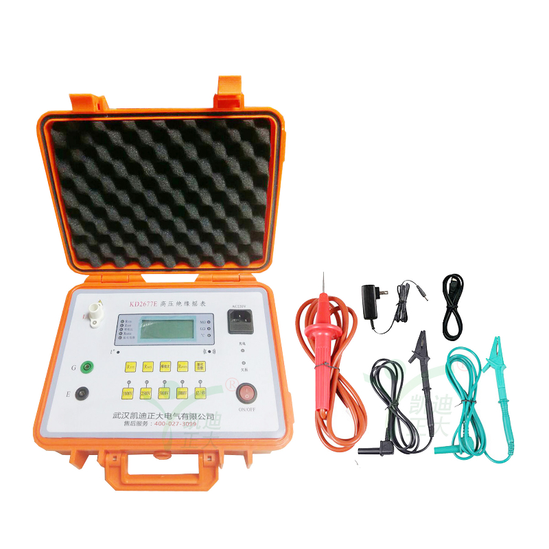 KD2677E高壓絕緣搖表采用高壓逆變電路將DC供電逆變?yōu)轭~定高壓輸出1000V、2500V、5000V,,10000V施加到被測(cè)試品兩端,采用了電壓、電流采樣電路,將采樣被測(cè)試品兩端的電壓和