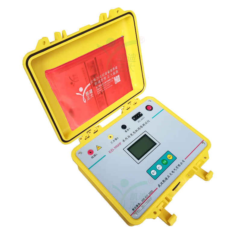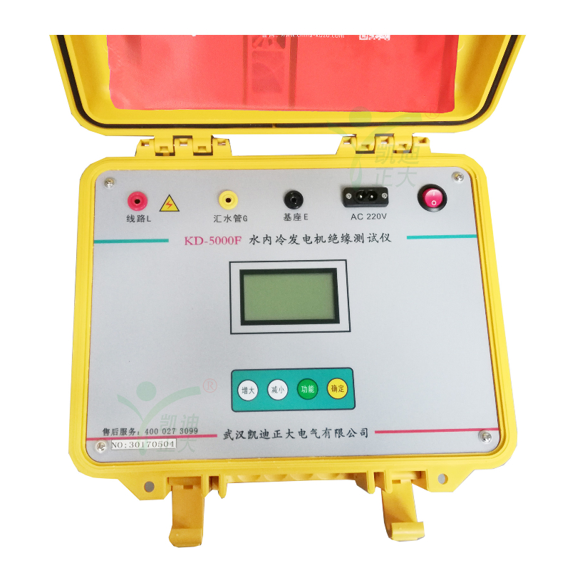 KD5000F水冷發(fā)電機(jī)絕緣電阻測試儀專用于水內(nèi)冷發(fā)電機(jī)的絕緣測量試驗(yàn),同時(shí)也可用于試驗(yàn)室或現(xiàn)場做其它材料的絕緣測試,輸出電流大于40mA。輸出電壓最大5000V,可測高達(dá)100GΩ的絕緣電阻。內(nèi)含高精度微電流測量系統(tǒng)、數(shù)字升壓系統(tǒng)。只需要用一條高壓線和一條信號(hào)線連接試品即可測量。測量自動(dòng)進(jìn)行,結(jié)果由大屏幕液晶顯示,并將結(jié)果進(jìn)行存儲(chǔ)。不需對(duì)水極化電勢(shì)進(jìn)行補(bǔ)償調(diào)節(jié),機(jī)座與匯水管間的電阻小至3kΩ,也可保證測量準(zhǔn)確度,水阻大于80kΩ時(shí),可保證測試準(zhǔn)確度。并自動(dòng)計(jì)算吸收比(R60S/R15S)和極化指數(shù)(R10min/R1min),自動(dòng)儲(chǔ)存15秒、1分鐘、10分鐘的絕緣電阻值。也可用于變壓器等其他電力設(shè)備的絕緣電阻測試。