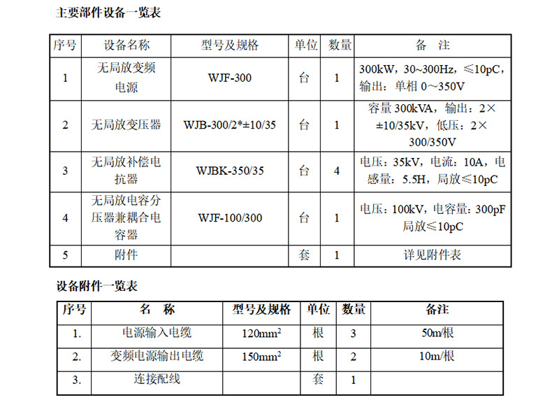 (1)設(shè)備型號(hào)及名稱(chēng): WJF-300kW無(wú)局放感應(yīng)耐壓試驗(yàn)裝置
