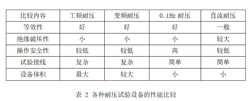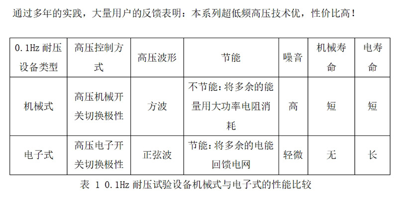 我公司新一代系列超低頻高壓發(fā)生器是采用自主研發(fā)的核心產(chǎn)品,采用 7 寸觸模屏、進(jìn)口高速AD采集電路,以及新生產(chǎn)工藝。提高了儀器質(zhì)量穩(wěn)定性,降低了設(shè)備的體積和重量,操作簡單,克服了國內(nèi)同類產(chǎn)品的諸多缺點(diǎn)(見表 1),性價(jià)比高于同類進(jìn)口產(chǎn)品的機(jī)械式升壓器使用壽命短、故障率高、體積大的缺點(diǎn)。相較于其他幾種耐壓試驗(yàn)設(shè)備方式而言,0.1Hz超低頻具有諸多優(yōu)點(diǎn),如表2。