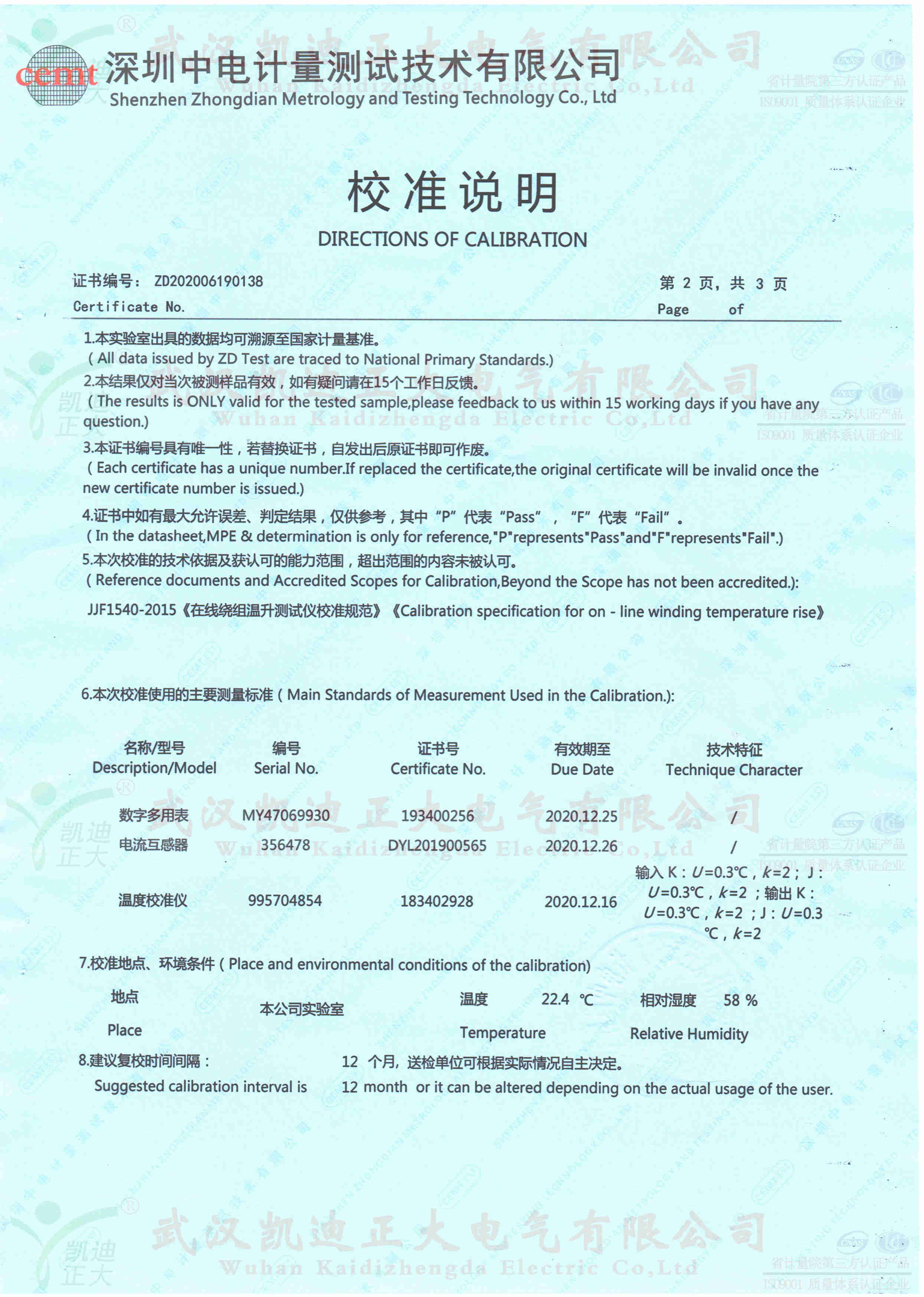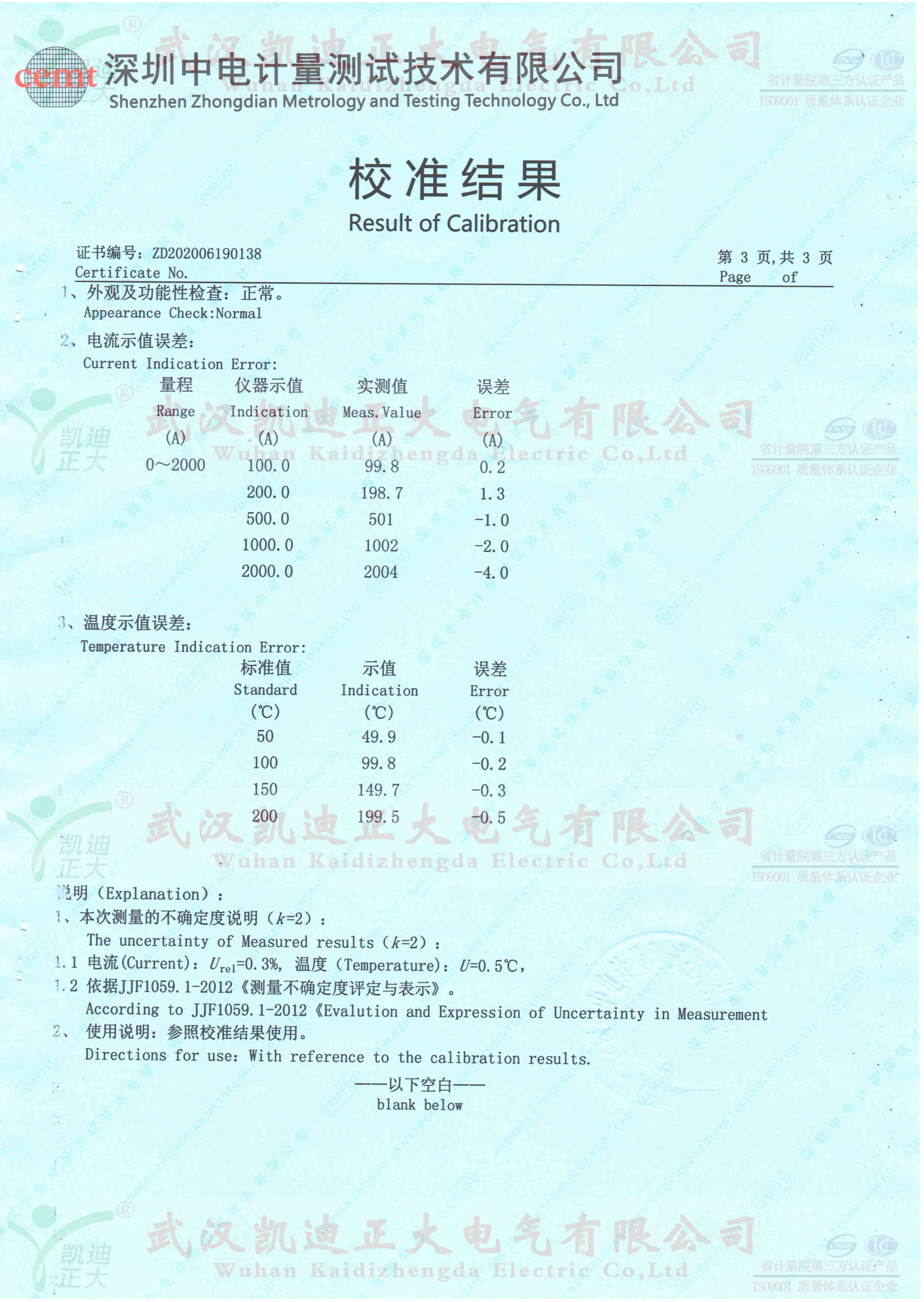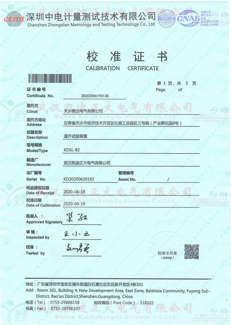 這次擔(dān)任我司檢測服務(wù)的是深圳中電計(jì)量測試技術(shù)公司,KDSL-82溫升試驗(yàn)裝置2000A,證書編號:ZD202006190138,校準(zhǔn)證書合格。