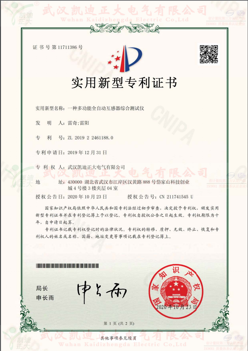 2、一種多功能自動互感器綜合測試儀。證書號第11711386號,專利號:ZL 2019 2 2461188.0,發(fā)明人:雷奇;雷陽,專利權人:武漢凱迪正大電氣有限公司,授權公告號:CN 211741545 U。