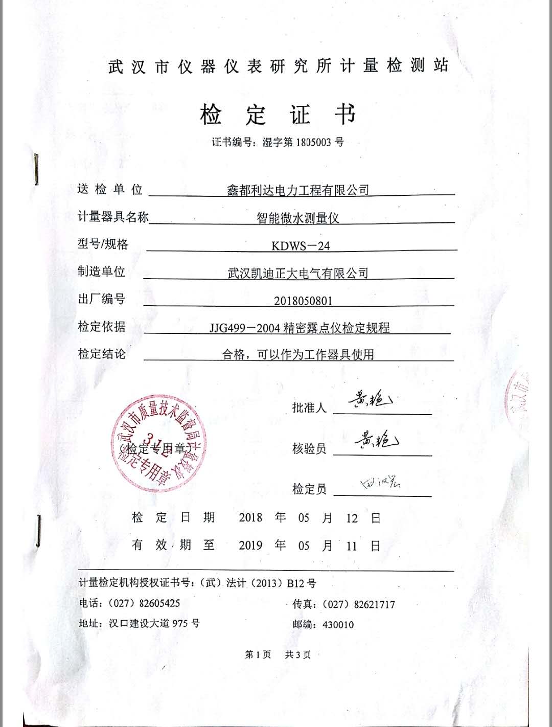 武漢市儀器儀表研究所計量檢測站,計量檢定機構授權證書:(武)法計(2013)B12號。武漢凱迪正大電氣有限公司生產(chǎn)的KDWS-24智能微水測量儀,出廠編號2018050801,符合檢定依據(jù)JJG499-2004精密露點儀檢定規(guī)程,可以作為工作器具使用。獲得武漢市儀表研究院計量站檢定證書,證書編號:濕字第1805003號。