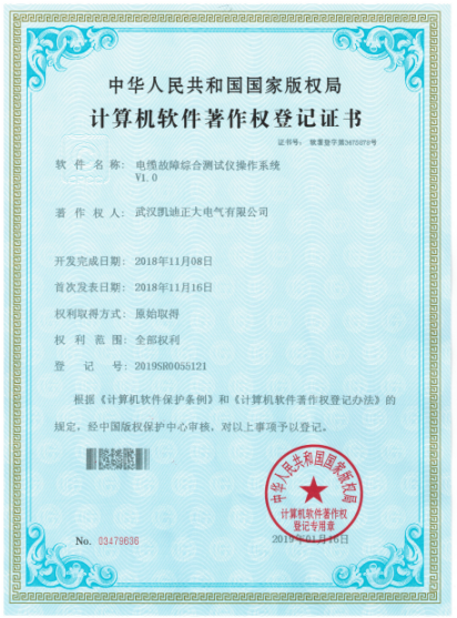 2019年,武漢凱迪正大電氣有限公司新力之作,榮獲中華人民共和國(guó)國(guó)家版權(quán)局《計(jì)算機(jī)軟件著作權(quán)登記證書》系統(tǒng)計(jì)算機(jī)軟件著作登記以及質(zhì)量管理體系認(rèn)證證書,其中包含電纜故障綜合測(cè)試儀操作系統(tǒng)V1.0(證書號(hào):軟著登字第3475878號(hào))、氧化鋅避雷器帶電測(cè)試儀操作系統(tǒng)V1.0(證書號(hào):軟著登字第3478045號(hào))、高壓開關(guān)動(dòng)作特性測(cè)試儀操作系統(tǒng)V1.0(證書號(hào):軟著登字第3478053號(hào))、變頻串聯(lián)諧振耐壓試驗(yàn)裝置操作系統(tǒng)V1.0(證書號(hào):軟著登字第3475581號(hào))、電纜震蕩波局放定位系統(tǒng)操作系統(tǒng)V1.0(證書號(hào):軟著登字第3475874號(hào))等證書共計(jì)5份。權(quán)利取得方式:原始取得。權(quán)利范圍:全部范圍。