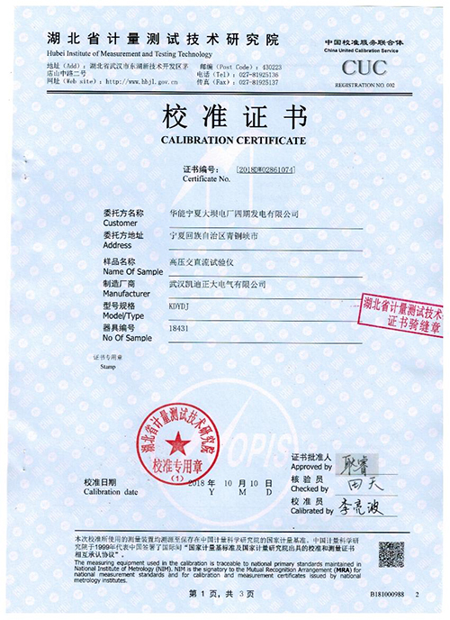武漢凱迪正大KDYDJ高壓交直流試驗(yàn)儀校準(zhǔn)證書(shū)
