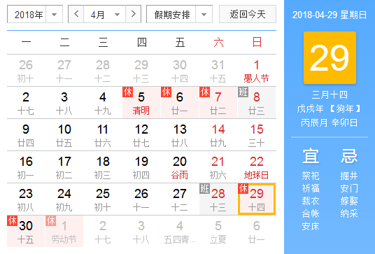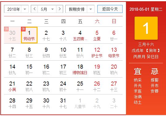 2018年五一放假安排時間表最新國務院官方發(fā)布: 4月29日(星期天)至5月1日(勞動節(jié),星期二)放假調休,共3天。 友情提示:4月28日(星期六)上班。
