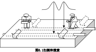 發(fā)射機的方向與估計的管線的方向保持一致。接收機操作者要在搜索的區(qū)域的起始位置,接收機的天線的方向保持與可能的地下管線的方向垂直。將接收機調(diào)到不會接收到直接從空中傳播過來的發(fā)射機信號的最高的靈敏度。當發(fā)射機與接收機的方向保持正確之后,兩個操作人員平行地向前移動,如圖6.1。提著接收機的操作人員在向前走動的過程中,前后移動接收機。發(fā)射機將信號施加到正下方的線纜,再由接收機探測到該信號。在接收機探測到的峰值的位置在地面上做好標志。在其它可能有線纜穿過的方向重復搜索。