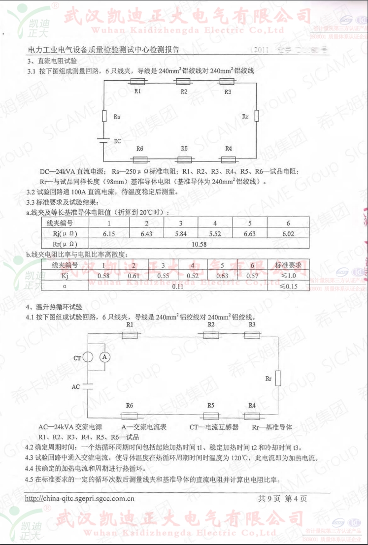 法國??芳瘓F(tuán)全資注冊的?,旊娏υO(shè)備公司,2011年6月在武高所電力工業(yè)電氣設(shè)備質(zhì)量檢驗(yàn)測試中心檢定H型線夾。檢測結(jié)論:根據(jù)DL/T765.1-2001對希瑪電力設(shè)備送檢的HC650型H形線夾進(jìn)行了尺寸和外觀檢查,結(jié)構(gòu)和組裝檢查,直流電阻試驗(yàn)、溫升試驗(yàn)、熱循環(huán)試驗(yàn)、短路電流試驗(yàn)和握力試驗(yàn),檢測項(xiàng)目合格。