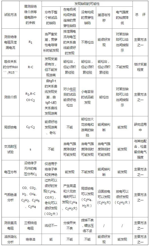 從表中可見,每種試驗(yàn)方法都只能發(fā)現(xiàn)某一方面的絕緣缺陷,因此,單靠一種試驗(yàn)方法,有時(shí)很難判斷絕緣好壞,須根據(jù)各種試驗(yàn)方法的特點(diǎn)和試驗(yàn)結(jié)果,相互比較與補(bǔ)充,力求作出準(zhǔn)確的判斷。這就要求我們在實(shí)際工作中,掌握各種試驗(yàn)方法,注意提高綜合試驗(yàn)分析的能力。