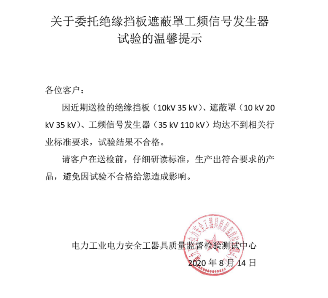國家檢測中心是代表電力行業(yè)的權威質(zhì)量監(jiān)督檢驗測試機構(gòu),具有社會第三方的公正地位。需要獲得國家技術監(jiān)督局頒發(fā)的《計量認證合格證書》,才能認定檢測產(chǎn)品包括:攜帶型短路接地線、電容型驗電器、安全帶、安全帽、遮蔽罩、絕緣隔板、登桿腳扣、絕緣硬梯、電絕緣橡膠板、絕緣墊、絕緣手套、絕緣鞋(靴)、高壓帶電顯示裝置、防墜落裝置、緩沖器、鋼絲繩吊索、纖維繩吊索、吊裝帶、手拉葫蘆等共計59大類260個檢測項目/參數(shù),此外還承接近電報警器、帶電指示器、驗電器信號發(fā)生器、高壓拉閘桿、登高板、絕緣繩等產(chǎn)品的檢測。