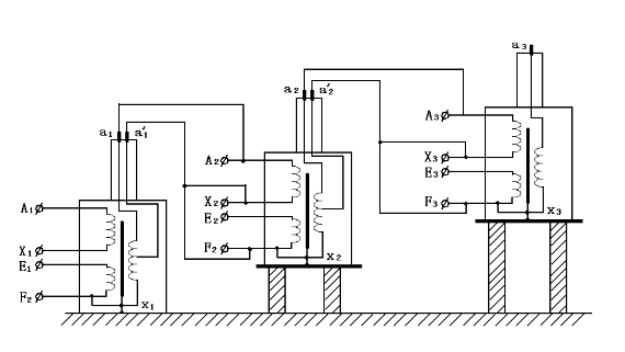 為了得到更高電壓的試驗(yàn)變壓器,也可采用串級(jí)的方法獲得更高的電壓。圖二為三級(jí)串試驗(yàn)變壓器的原理接線圖。其中三臺(tái)變壓器的容量和電壓關(guān)系滿足:P1=2P2=3P3,U(總)=U1+U2+U3S,