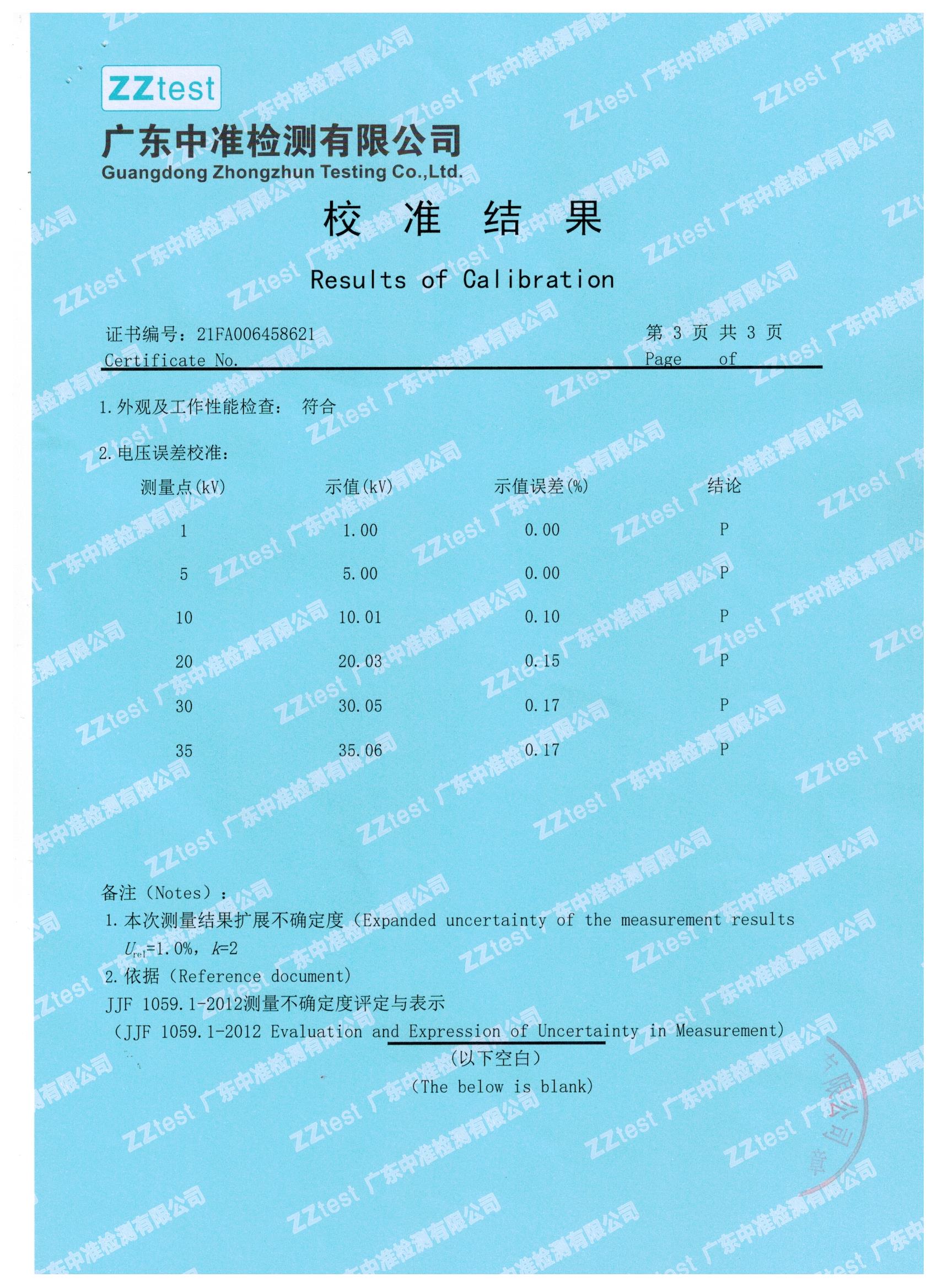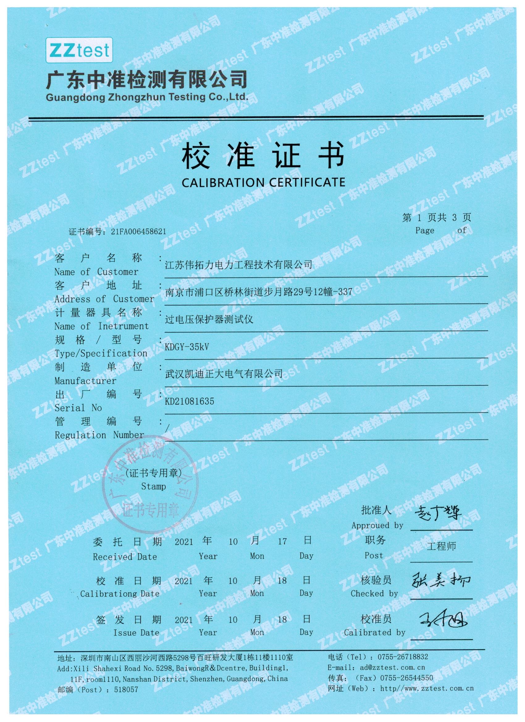 我們一直嚴(yán)把質(zhì)量關(guān),下面就是我們與江蘇偉拓力合作的過電壓保護(hù)器測試儀設(shè)備送檢結(jié)果