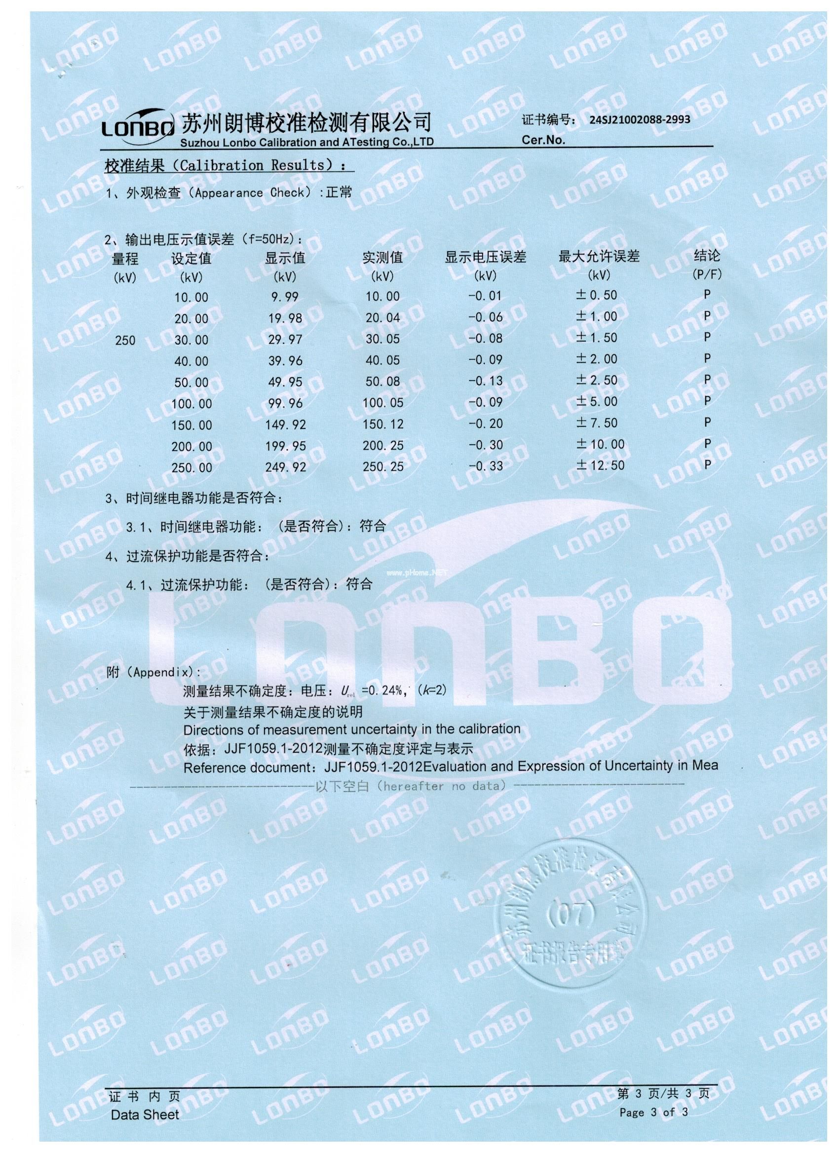 工頻耐壓試驗裝置,并由甲方委托蘇州朗博校準(zhǔn)檢測有限公司出具檢測報告。