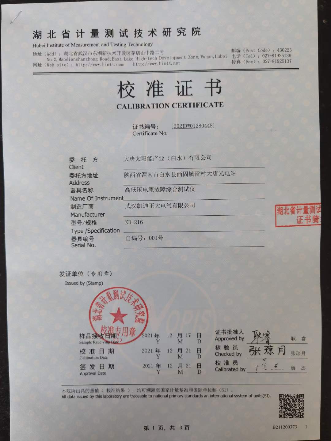 2021年12月22日,大唐太陽(yáng)能產(chǎn)業(yè)(白水)有限公司采購(gòu)我公司一批高低壓電纜故障綜合測(cè)試儀。為彰顯本公司產(chǎn)品的實(shí)力與質(zhì)量,凱迪正大雷總攜帶本公司生產(chǎn)的KD-216高低壓電纜故障綜合測(cè)試儀前往湖北省計(jì)量測(cè)試技術(shù)研究院中南國(guó)家計(jì)量測(cè)試中心對(duì)產(chǎn)品進(jìn)行檢測(cè),經(jīng)過多次測(cè)量與檢測(cè)后,產(chǎn)品完整通過每一條檢測(cè)并獲得了校準(zhǔn)證書。