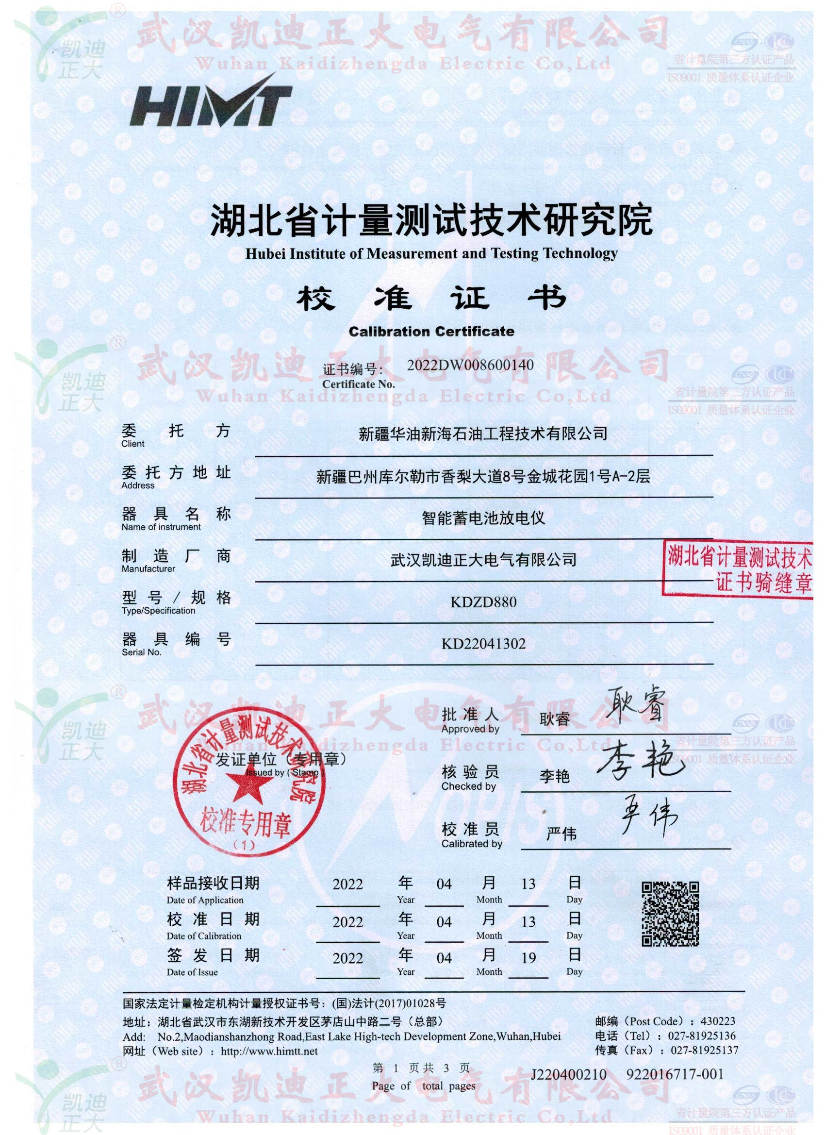 今年3月份,新疆華油工程部劉工致電我司。吐槽之前買的一批揚州某公司設(shè)備,使用不是很理想。這次選擇我們的KDZD818智能蓄電池內(nèi)阻測試儀、KDZD882智能蓄電池放電監(jiān)測儀等設(shè)備。話說“一朝被蛇咬十年怕井繩”,這次購買設(shè)備還是對比武漢幾家企業(yè)后綜合售后服務(wù)、品牌力、設(shè)備性能對比選擇我司,簽署技術(shù)協(xié)議并要求獲得湖北省計量測試技術(shù)研究院檢定報告,對于這些常規(guī)要求,我司幾乎有實力、有信心能夠獲得計量證書。