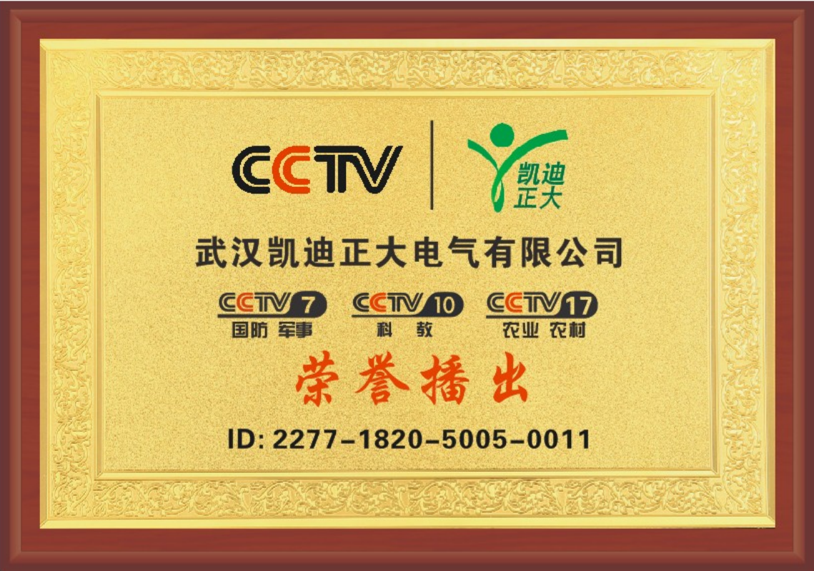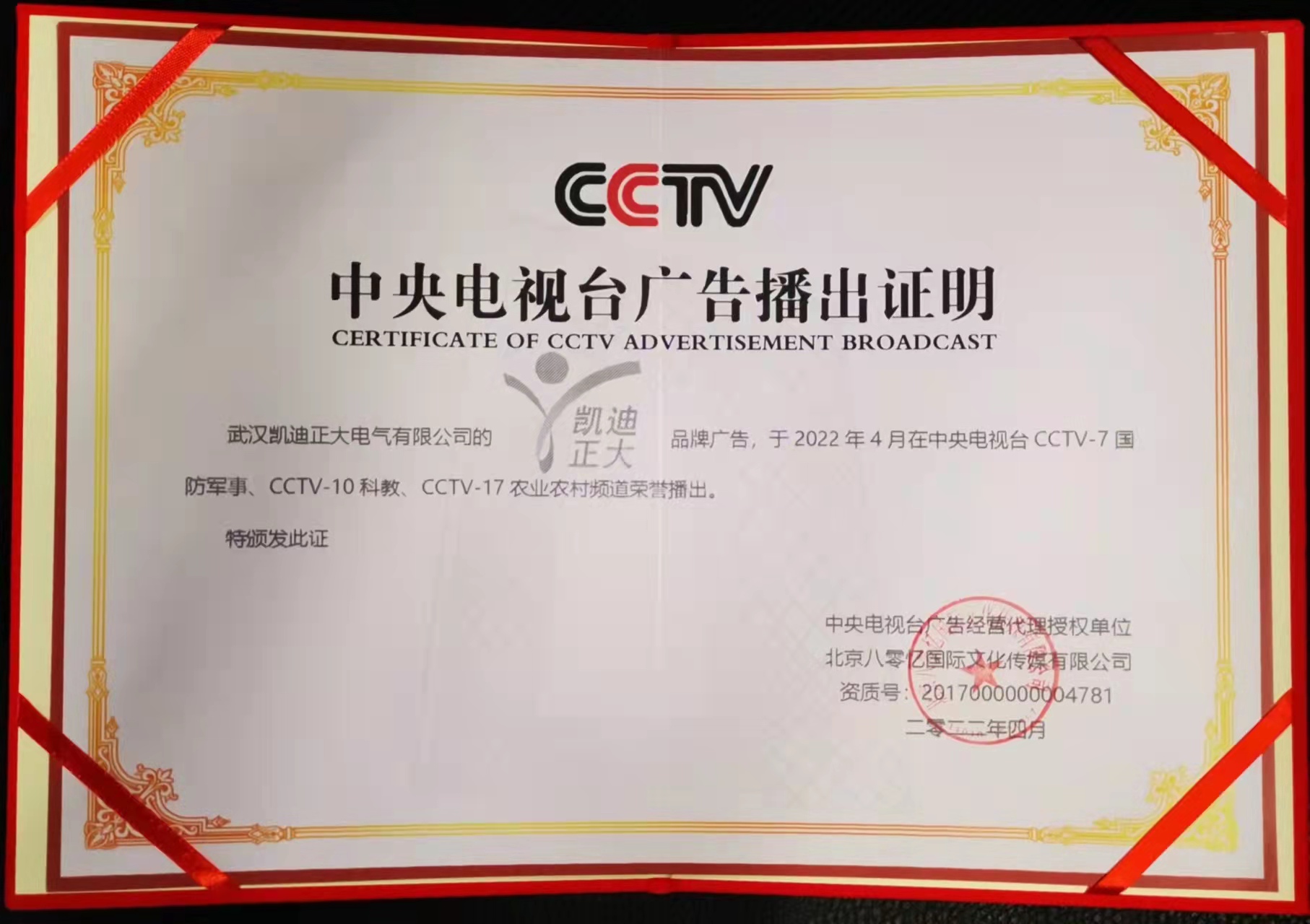 2022年4月,武漢凱迪正大電氣有限公司品牌廣告正式登陸中央電視臺(tái)CCTV-7國(guó)防軍事頻道、CCTV-10科教頻道及CCTV-17農(nóng)業(yè)農(nóng)村頻道,向全國(guó)觀眾展示武漢凱迪正大的實(shí)力與信念。