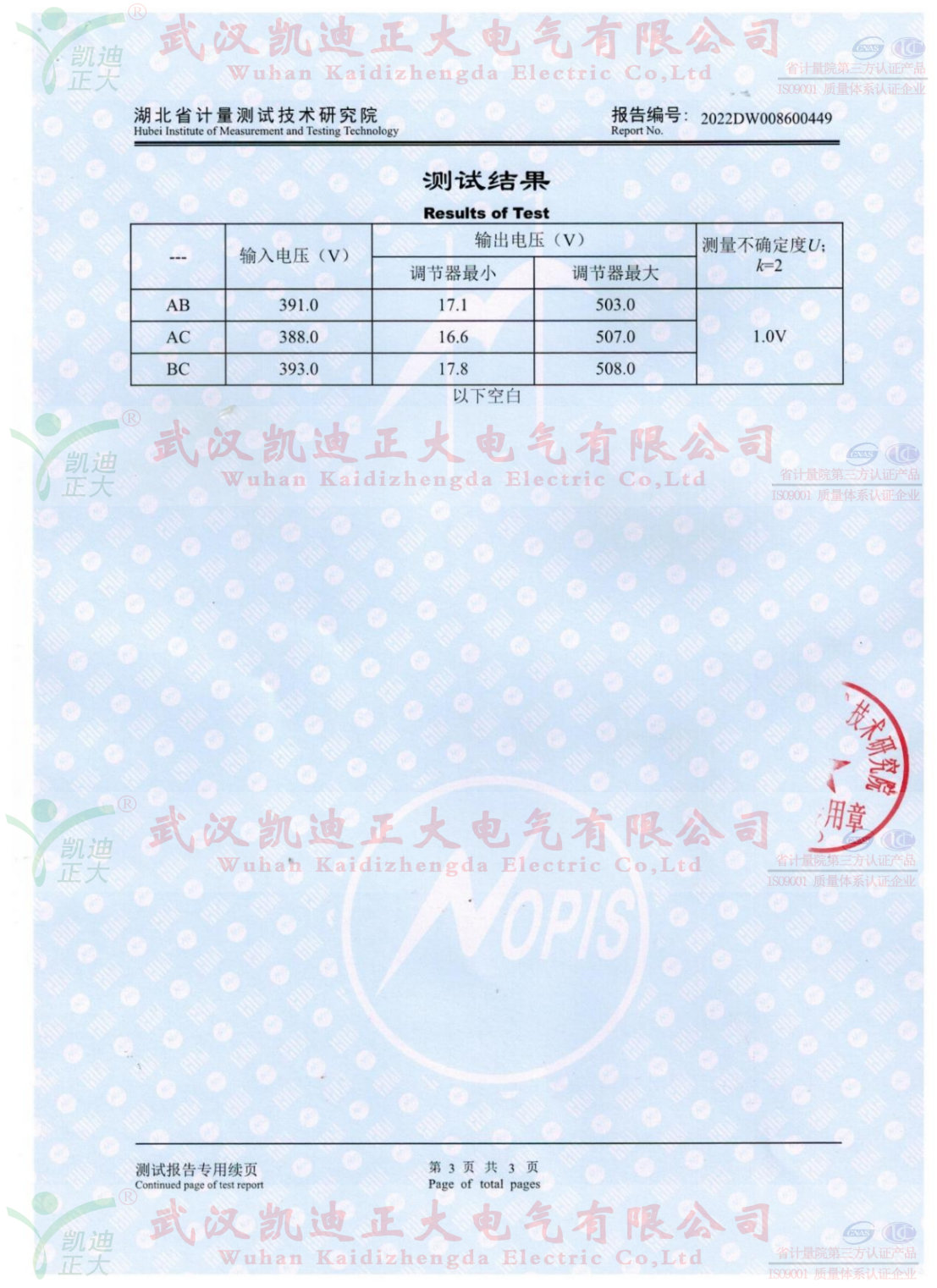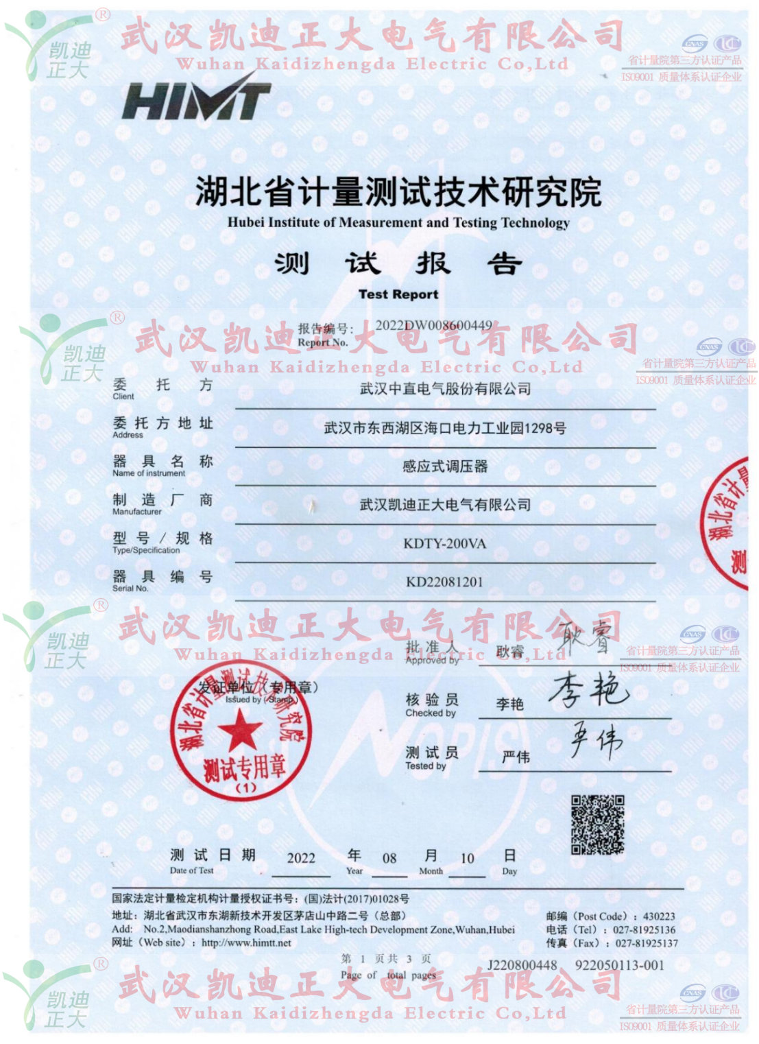 由于供應速度、售后服務態(tài)度因素很快就收到了長興電器集團中直電氣股份公司的采購訂單。感應調壓器送湖北省計量測試研究員測試的紙質報告已出。送檢結果如下:本次檢測是以數(shù)字多用表為主要檢測設備,以JJF 1587-2016《數(shù)字多用表校準規(guī)范》為技術依據(jù),由湖北省計量測試技術研究院檢測完成的。