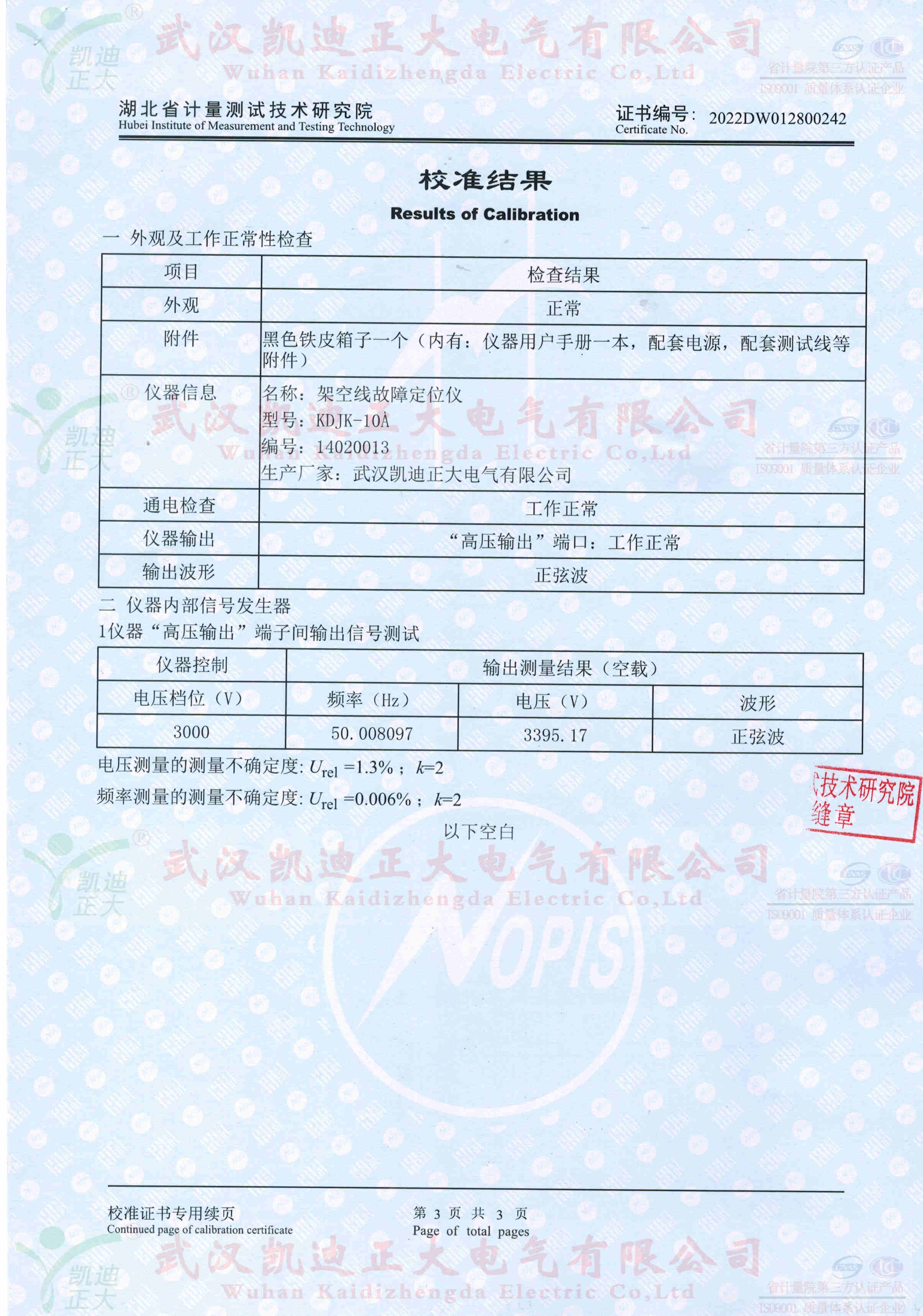 KDJK-10A故障檢測儀特性及技術(shù)參數(shù)獲得湖北省計量測試技術(shù)研究院的校準(zhǔn)證書,設(shè)備為電力工業(yè)電氣設(shè)備質(zhì)量檢驗測試中心的要求。計量設(shè)備的高壓測試輸出的電壓、波形正玄波、電壓檔位的選擇。