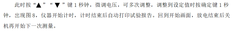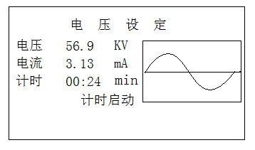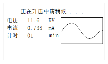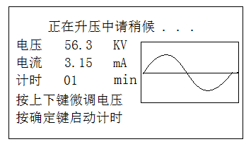 自檢成功后,儀器自動進入升壓狀態(tài)。儀器將用若干個周期的時間(幾分鐘)將電壓升至設(shè)定值。在升壓過程中,按停機鍵,儀器將切斷電壓輸出,回到開始畫面。當(dāng)升壓值接近設(shè)定值時出現(xiàn)圖7