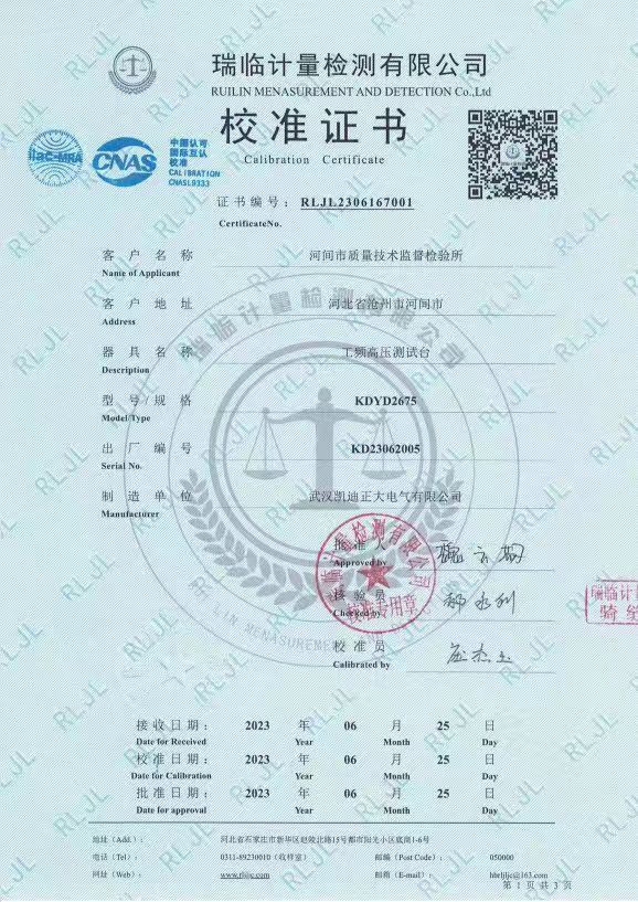 河間市質(zhì)量技術(shù)監(jiān)督檢驗所采購我司KDYD2675 工頻高壓測試臺,應(yīng)技術(shù)要求送第三方檢測機構(gòu)瑞臨計量檢測有限公司檢定。