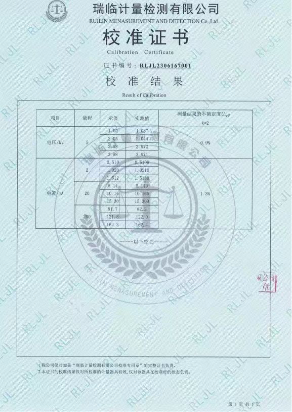河間市質(zhì)量技術(shù)監(jiān)督檢驗所采購工頻高壓測試臺獲瑞臨計量檢測報告