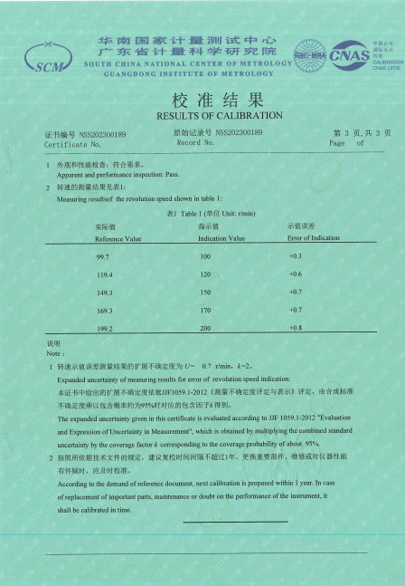 參照FFN9902-2009 恒轉速源校準方法 C.M.for Constant Revolution Speed Source 檢定要求,CY3恒速器(恒轉速源)獲得NSS202300189檢定證書。