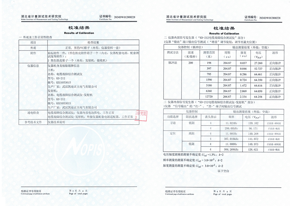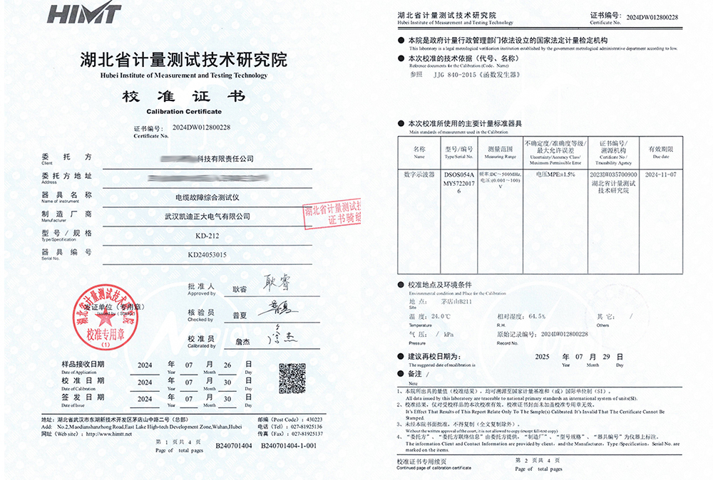 值得強(qiáng)調(diào)的是,KD-212電纜故障綜合測(cè)試儀不僅贏得了河北地震局認(rèn)可,還順利通過了湖北省計(jì)量測(cè)試技術(shù)研究院的嚴(yán)格檢測(cè),獲得了校準(zhǔn)證書,這再次證明了其技術(shù)水平和測(cè)量結(jié)果的準(zhǔn)確性。