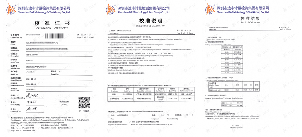 近日,山東某能源分公司采購凱迪正大電氣生產(chǎn)的KDJF-IV局部脈沖探測儀順利通過了深圳市達豐計量檢測集團有限公司的校準(zhǔn)。
