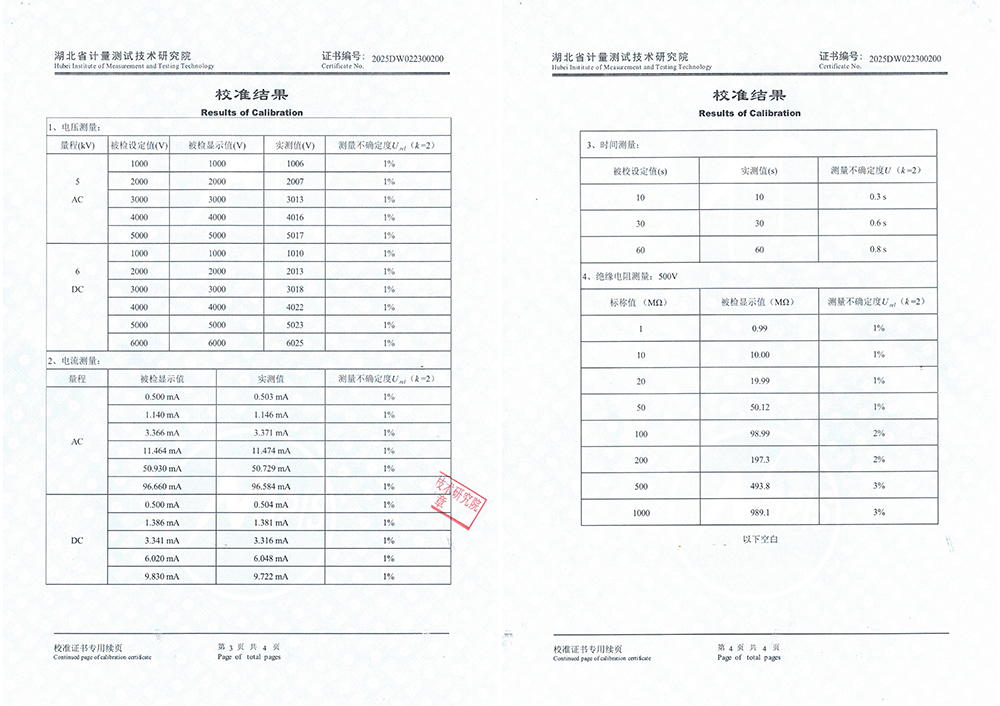 此次校準(zhǔn)過程對KD7742智能絕緣耐壓測試儀來說是一次嚴(yán)苛的考驗。湖北省計量測試技術(shù)研究院作為計量校準(zhǔn)機構(gòu),以其專業(yè)的技術(shù)水平和嚴(yán)謹(jǐn)?shù)男?zhǔn)流程著稱。校準(zhǔn)過程中,研究院對KD7742的各項性能指標(biāo)進(jìn)行了全面、細(xì)致的測試和評估,包括其交/直流耐壓測試、絕緣電阻測試等功能模塊的準(zhǔn)確性和穩(wěn)定性。經(jīng)過一系列嚴(yán)格的測試,KD7742智能絕緣耐壓測試儀成功通過了校準(zhǔn),獲得了校準(zhǔn)證書。這不僅證明了KD7742智能絕緣耐壓測試儀在設(shè)計和制造上的品質(zhì),也體現(xiàn)了武漢凱迪正大電氣有限公司對產(chǎn)品質(zhì)量的嚴(yán)格把控和持續(xù)追求。