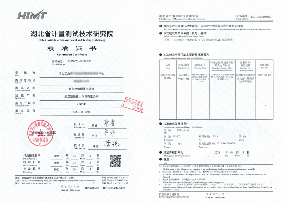 近日,電力工業(yè)某測試中心采購的武漢凱迪正大電氣有限公司的KD7742智能絕緣耐壓測試儀,成功通過了湖北省計量測試技術(shù)研究院的嚴(yán)格校準(zhǔn),并榮獲校準(zhǔn)證書。這標(biāo)志著KD7742智能絕緣耐壓測試儀在精確度和可靠性方面達(dá)到標(biāo)準(zhǔn),進(jìn)一步鞏固了其在電力測試領(lǐng)域的地位。